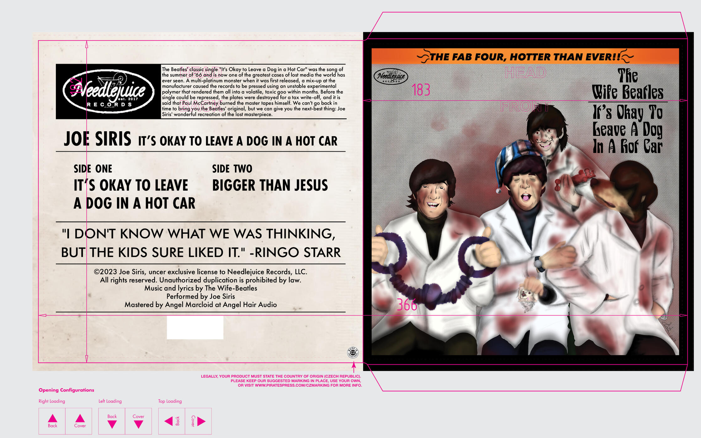 On the layouts side, we’ve been working on getting everything for the “It’s Okay To Leave a Dog in a Hot Car” single ready for production! The direction of these will follow the same “pastiche the Beatles so closely that it’s scary” mentality that the song itself embodies, and, well, we would consider it quite a success so far! Please ignore the era-inaccurate label.