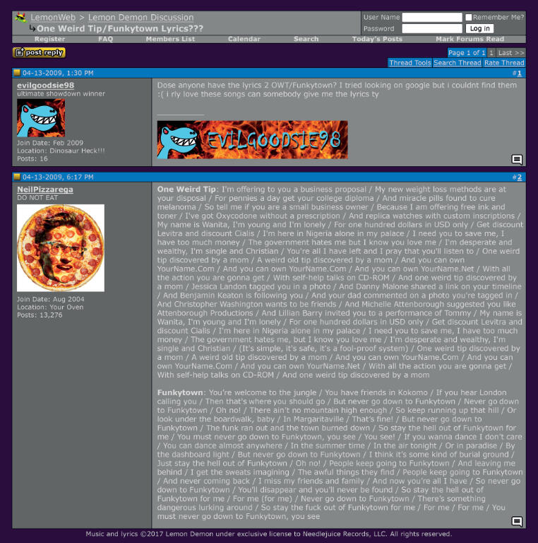 Next, in celebration of us finally getting the One Weird Tip CDs and Tapes ordered, here's a look at the web 1.0 era geek forum-inspired lyric insert designed by our own Brandon Brown. Savor it- you’re looking at the next generation of obscure Lemon Demon lore characters that will hopefully end up on a kid’s kinlist before the end of the year.