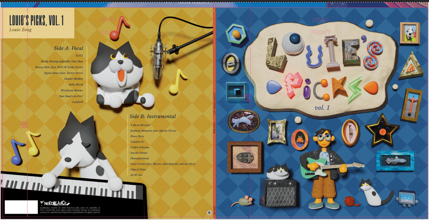 And, finally, we’ve got an update on Louie’s Picks. We’ve got art! and a tracklist! and final masters! Between the covers and insert and gatefold (yes, there is a gatefold. No, you don’t get to see it yet), this release is like a whole art exhibit in itself, and it will definitely be an absolute treat for any fan of Louie’s work. Take a look for yourself- you may just notice a few more of the surprises that lay in store…